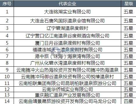 2015年,根據《溫泉企業服務質量等級劃分與評定》,全國溫泉星評委評選出了13家五星級溫泉和1家四星級溫泉。星級溫泉的評選,有利于企業提高整體管理水平,同時也有助于提升消費者的消費體驗,利于溫泉旅游行業的良性化發展。
