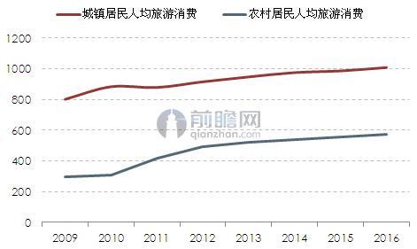 圖表2:2009-2016年中國城鎮和農村居民人均旅游消費(單位:元)