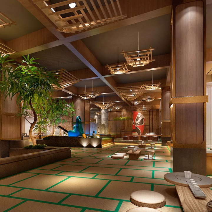日式洗浴設計陳設簡單,日式風格通常鋪有高出地面數十厘米的地板,以便使屋內東暖夏涼,也避免事內潮濕。一個約高于地面的榻榻米平臺是這種風格重要的組成要素,日式矮桌配上草席地毯、布藝或皮藝的輕質坐墊、紙糊的日式移門等。塌塌米是用稻草制作的厚草墊子,上面縫有細席子,做工極為精細。