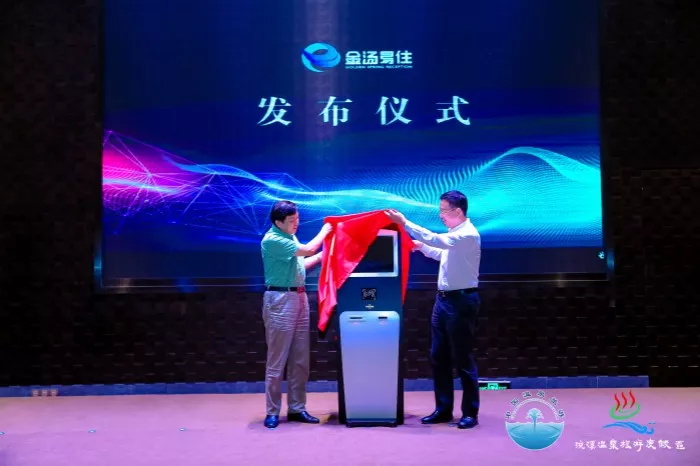 中國旅游協會溫泉旅游分會會長黃志敏、秘書長張越共同為第一臺金湯易住揭幕。