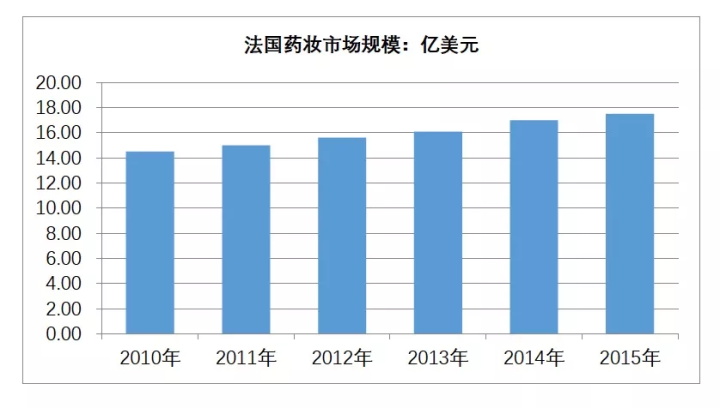 法國(guó)是全球藥妝產(chǎn)品主要生產(chǎn)及出口國(guó)之一,2015年法國(guó)藥妝市場(chǎng)規(guī)模達(dá)17.5億美元(見(jiàn)圖1)。