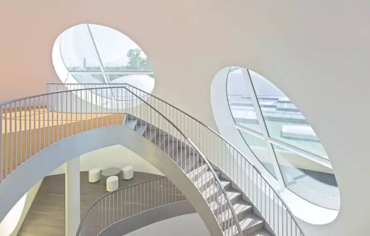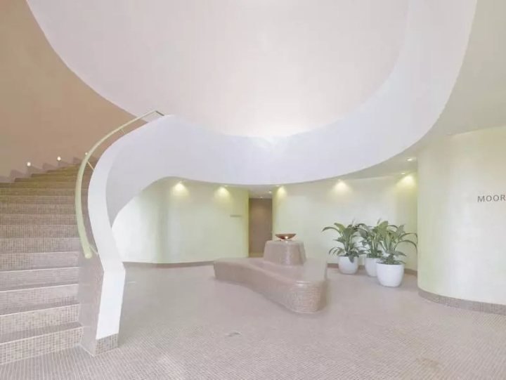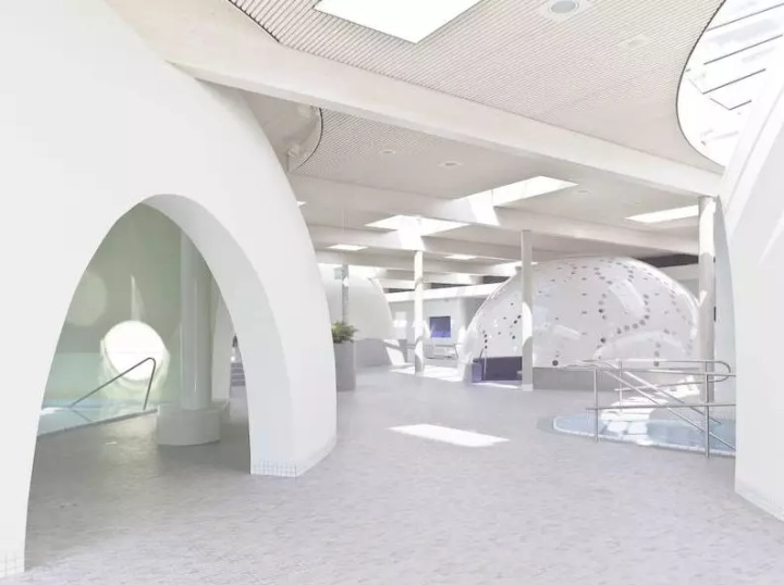 大廳光學(xué)寬敞的元素是圓頂和水上樂園。地板被調(diào)制為躺下或坐著的景觀,或用于全景視圖,標(biāo)記路徑,位置和形式區(qū)域。