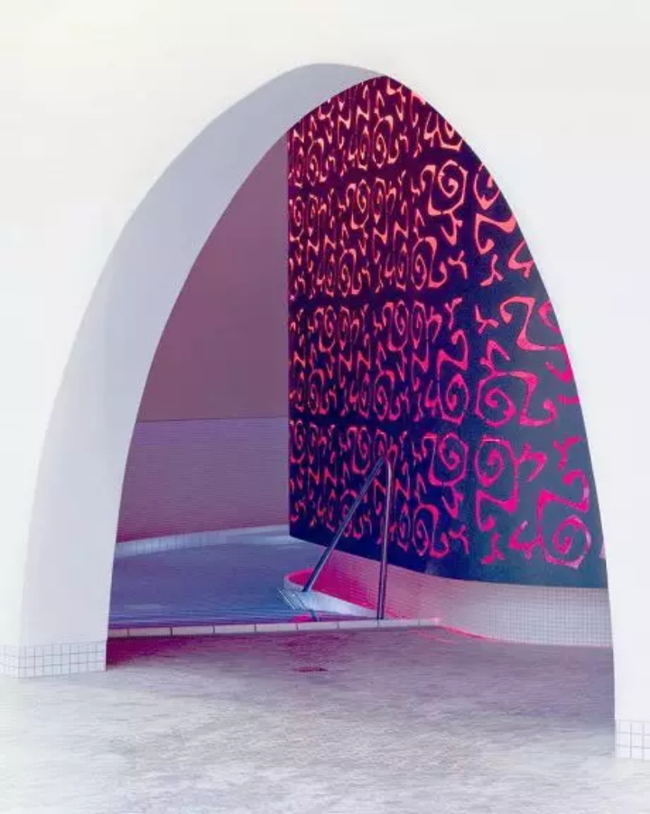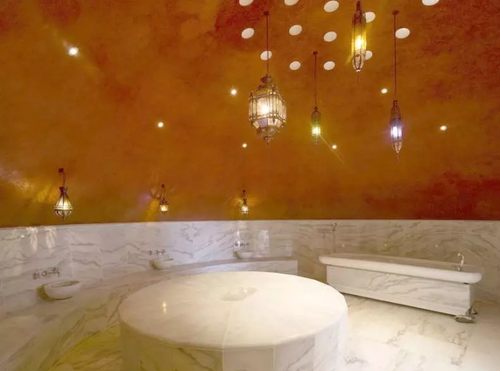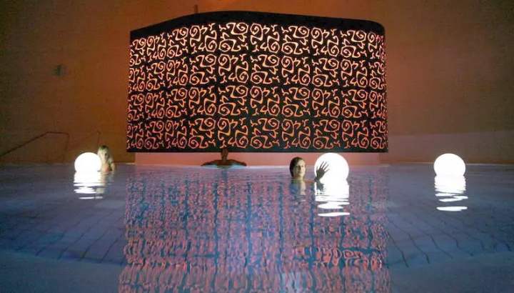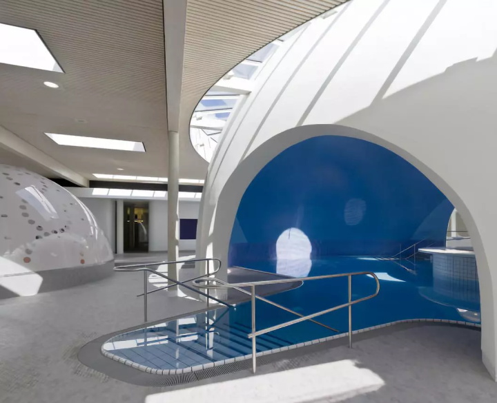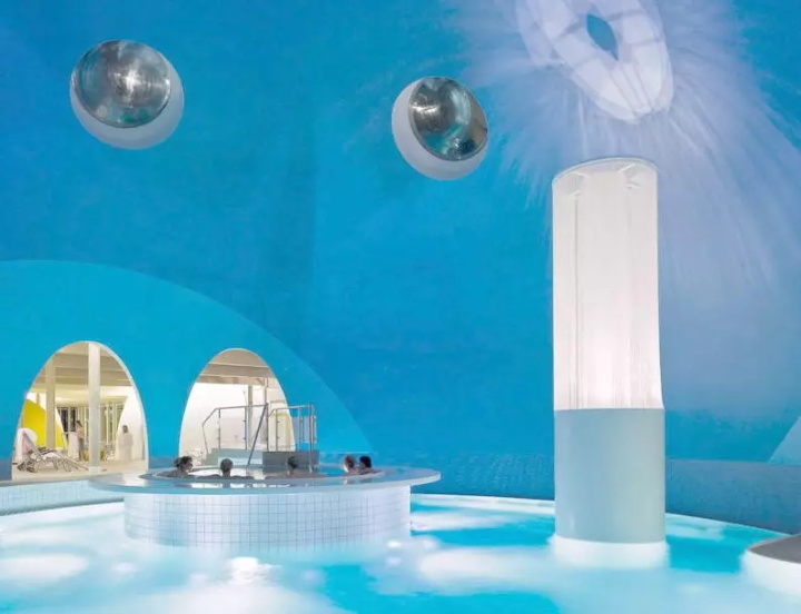 半透明的圓頂從溫泉大廳發(fā)出紅色和藍(lán)色。內(nèi)置燈與藍(lán)色和紅色瓷磚盆相結(jié)合,增加了觸覺、光學(xué)熱量和冷感。