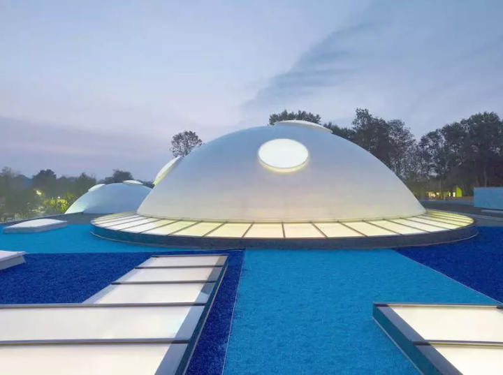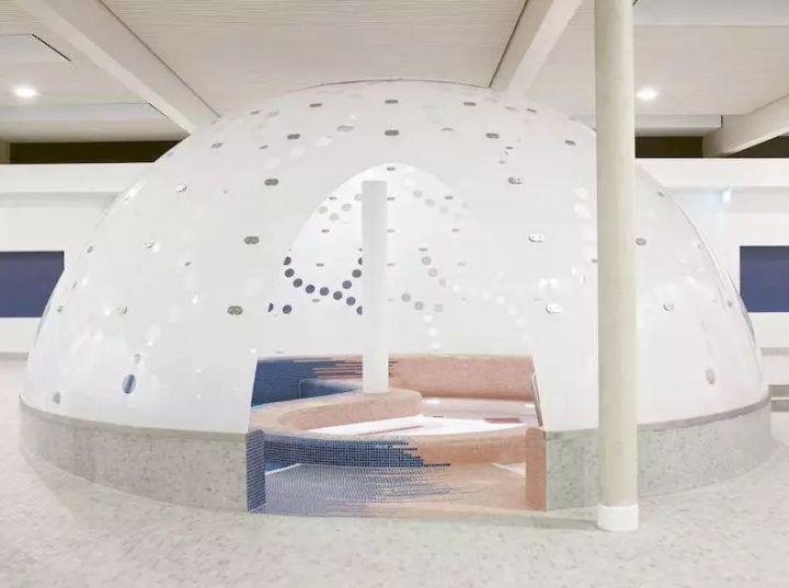圓頂大部分不透明,由各種圓形開口穿孔。每個(gè)圓頂都具有明顯的個(gè)性特征,融合自然光和人工照明,使用不同的材料和顏色,不同的水功能和聲學(xué)品質(zhì)。