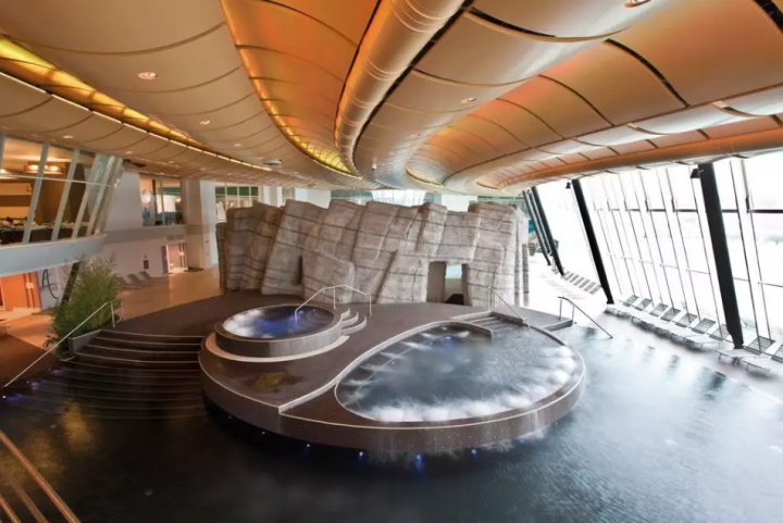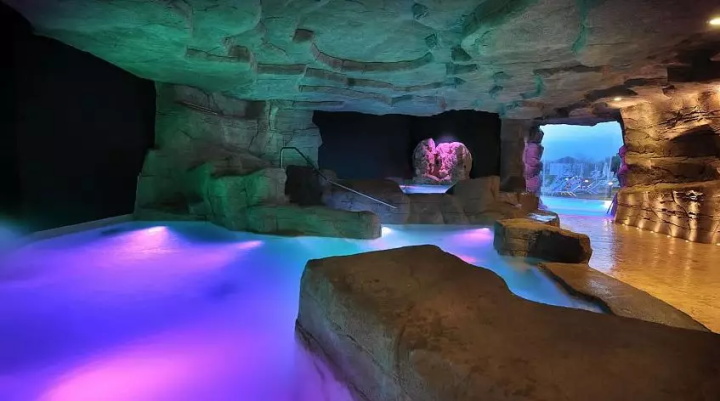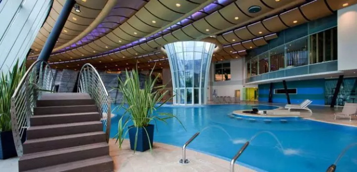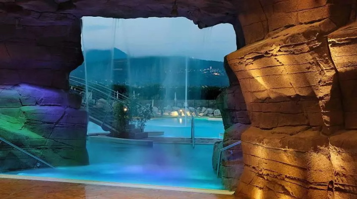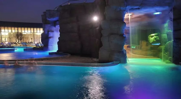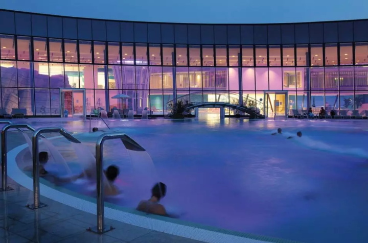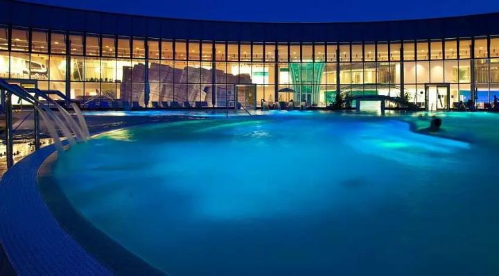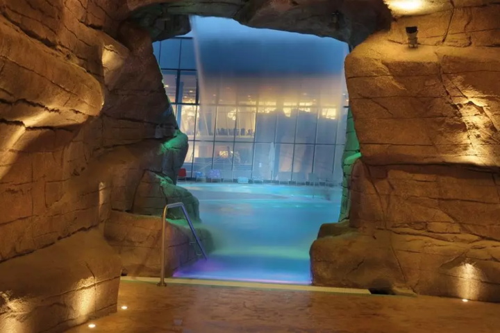 溫泉水療主館占地8000㎡,包括溫泉池,隔離水盆,小海灣,緩慢的溫泉河配備水力按摩和治療射流,提供內外移動的刺激和魅力。色光療法洞穴,鹽池(來自死海的水)和洞穴中的瀑布代表了旅程中各種迷人的景點。