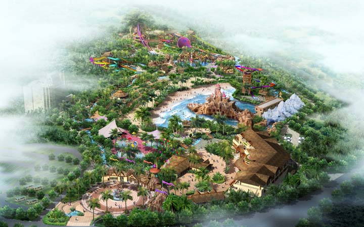 三亞夢幻水上樂園的的規劃布局高差分明,空間基地錯落有致,景觀空間以道路為脈絡、以山水為背景,通過“山體—叢林—水上”結合,實現立體化發展。主題元素結構是熱帶雨林、黎苗風情。通過熱帶雨林的地理景觀與黎苗民族的風貌結合為一體,高差錯落有致的景觀空間結構,營造立體化體驗氛圍。