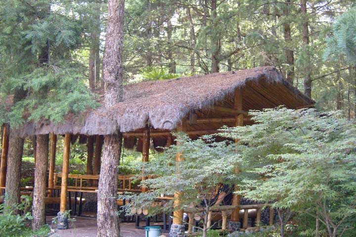 在溫泉建筑方面,云南省安寧市金方日式森林溫泉的建筑設計較為成功。該森林溫泉是以直線型為主的大屋頂日式建筑,水平的線條與樸素的材料(如木材、茅草、石材等)將建筑與周圍的溫泉環境融為一體,營造了簡潔、肅穆的日式森林溫泉建筑。同時,當森林小屋屋檐和木板鋪裝遇到大喬木時,為保護原有良好的森林生態環境,均采用了挖空、避讓的原則,充分保護了原始森林,體現了人性化特色。