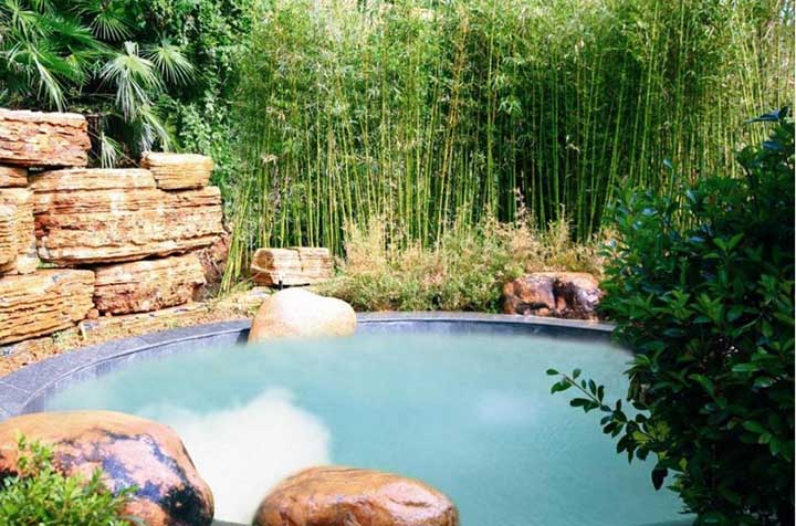 溫泉場地內應種植能適應濕度較大、溫度較高環境的植物,且針闊混交,樹齡大、樹冠大較好。如云南省安寧市金方森林溫泉上部空間多采用具有日式庭院代表性的細葉類植物,如云南油杉等,營造了良好的遮蔭、清涼的效果;下部空間由于濕度大,多采用蕨類、八角金盤等,并且利用了層次較為分明的植物營造出泡溫泉的私密空間。